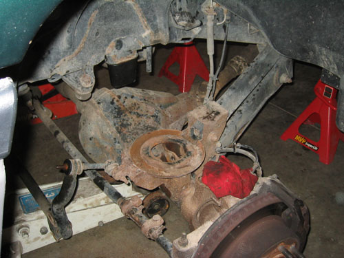 the KORE techs say remove the front tires and jack up the frame and the spring come right out then slide the KORE spring in there . like 15 mins each side