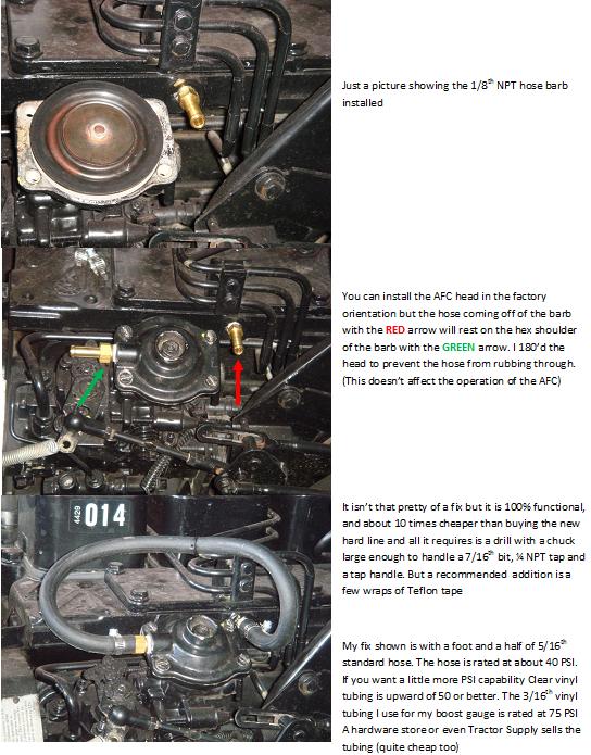 the little metal pipe comin off the manifold to the afc was already broke i looked a pictures and it aint sussposed to be a hose. So i have enough of that bolt i dug up some good hose an clamped down both ends idk if thats two much air comin into the injector pump but i drove it and didnt have no prob's. its a quick fix for now until i get the right stuff i reckon