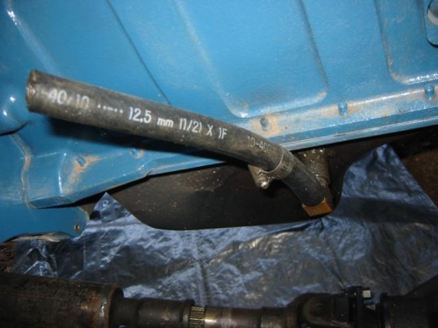 Hose 2: There is another one on the LEFT SIDE of engine toward back on a 45deg down hookup tube. This is an older pic---now I have a large hose hooked up there and dropping down and back of the engine. Yep, it's just hanging down below the pan and ready to pickup any sort of crap off the road... It seems like a vent as well so I wouldn't think it would be sucking up anything from the dirt I drive over?