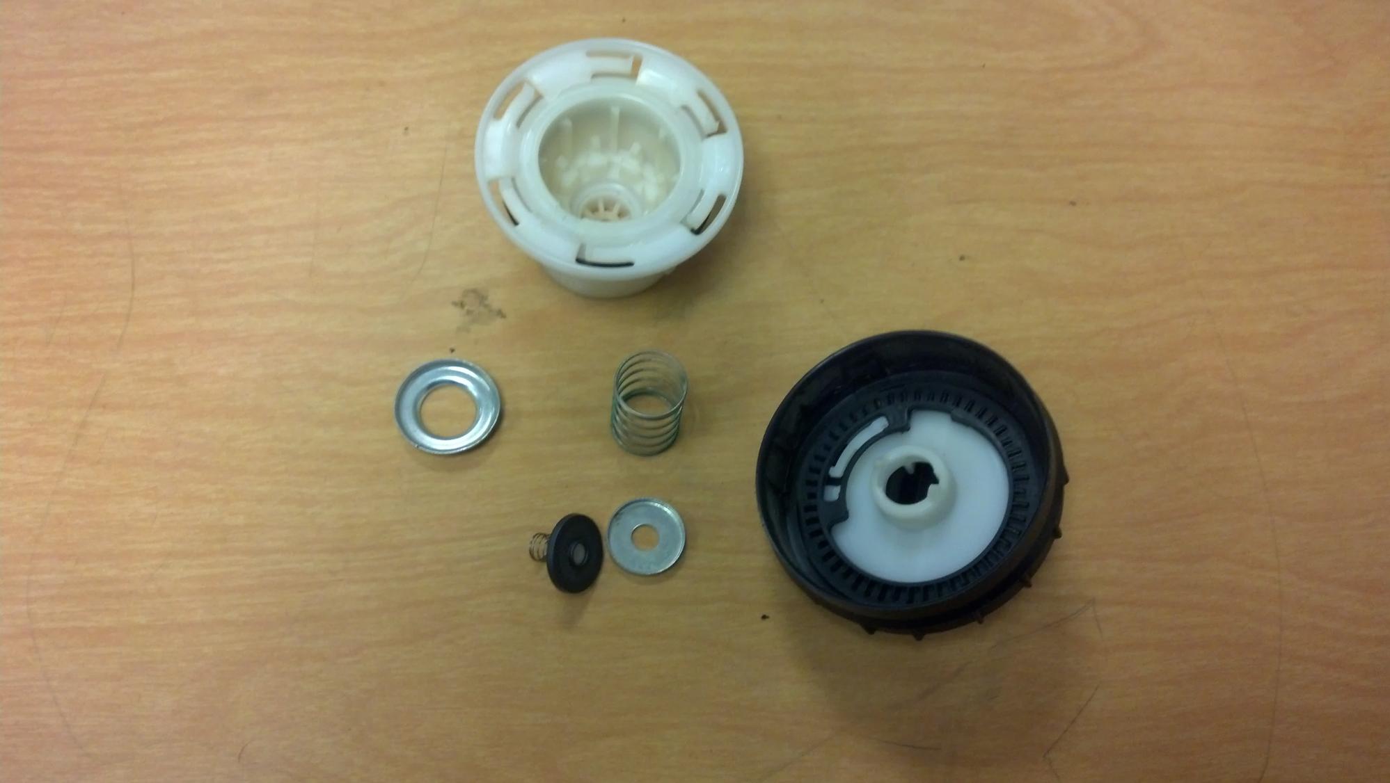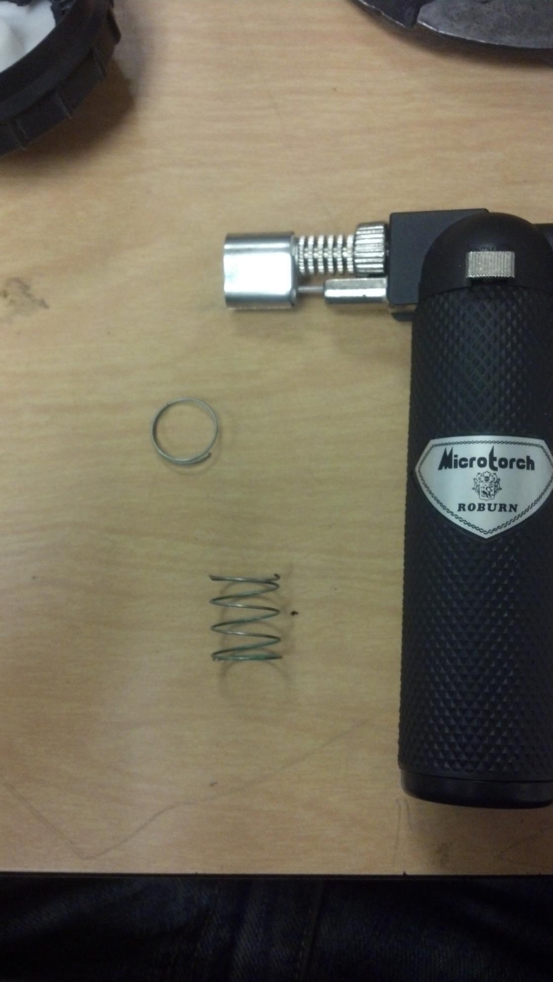 Took the cap apart. Cut a full coil off the big spring with a pair of diagonal cutters(Which controls the fuel tank PRESSURE. Don't need a gajillion PSI here.) Heated top coil a little and bent it down to resemble the original configuration.