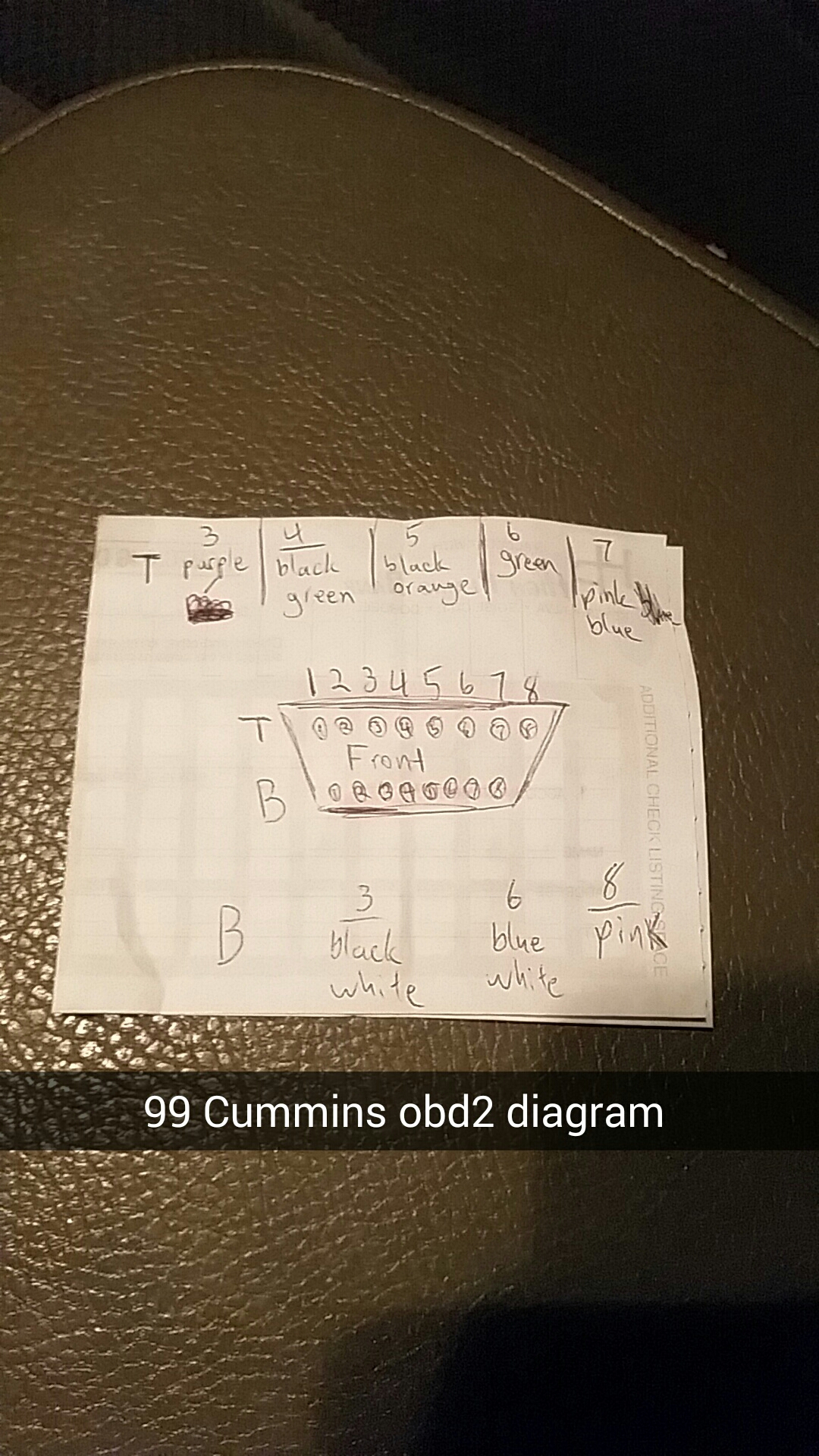 My friend in North Dakota had all the wires ripped from the back of his obd2 port. He has the smarty touch stupid visible tuner so everyone knows he has one. Anyways I was able to get pictures of 1999 dodge Cummins short obd2 but the truck is auto and my friends is a 5 speed and it's a 2001 will the obd2 wires be the same on both trucks? If not any help would be nice. This is what I was able to get him
