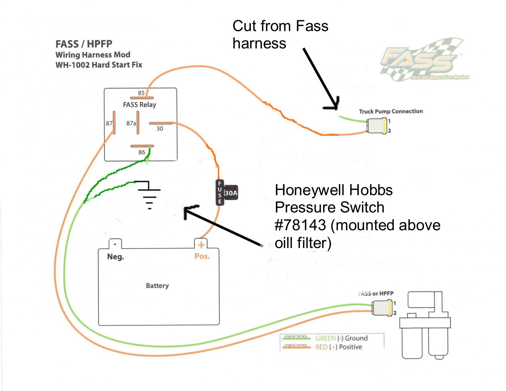 Had some hard starting issues after my Fass installation. Tried different ways and found this to work the best up in Canada's winter. Ran an extra wire with alligater clips from Hobbs switch to battery for bleeding the system after filter change. May help some of you with the hard starts due to diaphram issues.