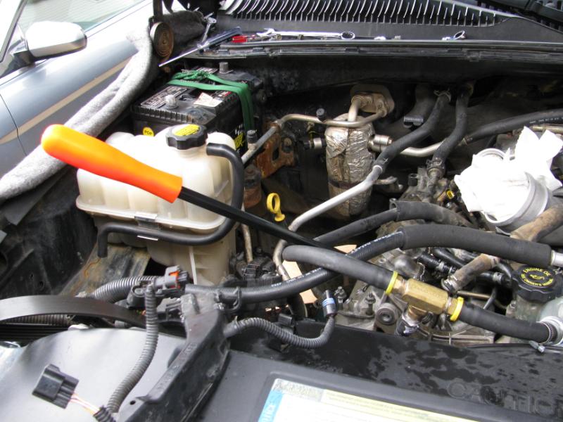 Be very careful when re installing it and make sure it goes in straight, you can put your finger in the cup and slide it into the bore ad make sure its lined up and completely straight. slide the cup in until the first o ring goes in and check to see if the cup is still going straight down the bore and push it in a little more. GM says to use a brass drift to drive the cup into the bore the rest of the way, you can use a 24mm socket put onto an extension backwards. The extension barely fits in between the valves and since its backwards on the socket it gives it a large flat even surface to drive the cup in. drive it in until its flush with the bore.