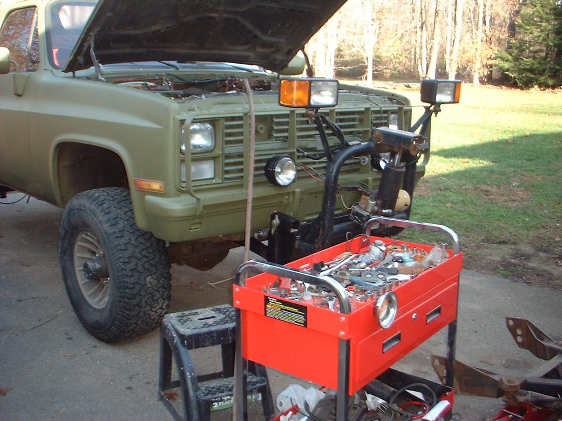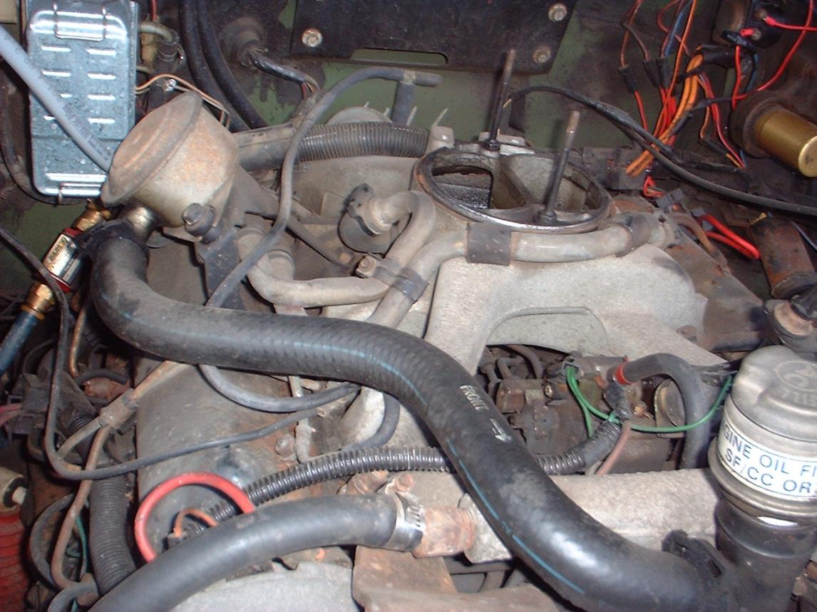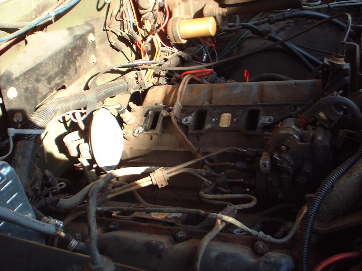 First step, get the tools ready. Also take note of the double nuts on the air cleaner. I strongly suggest doing this. Here's what can happen if you don't..The studs break from vibration at the base and then flop around and eventually work loose from the wing nuts and the guess where they end up ??? I was pretty pissed having to toss a perfectly good 6.2 in my 83 after it made it's way into the cylinder and destroyed the head, piston and cracked the cyl wall. Also I like a few shots of the motor before I take it apart in case I get Alzheimers mid project...