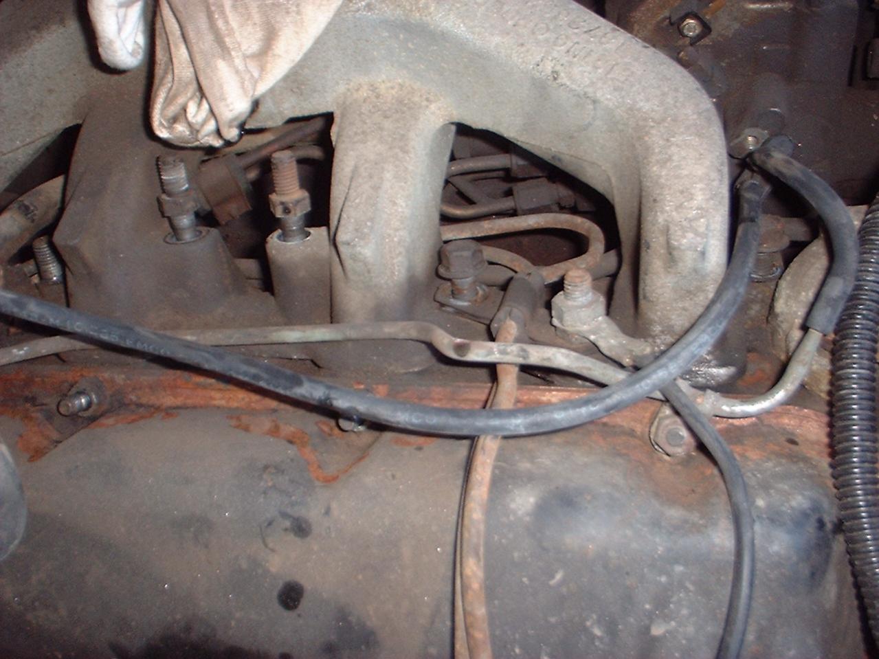 Next step is to remove the intake. I strongly suggest taking an air blow gun and blowing compressed air all around the intake flages and try to blow away any losse crap that might fall into the head when the intake is lifted off. Then next step is to remove the CDR(That tuna can looking thing). Mine was full of oil and probably original so that is on the replace list. The little stupid clamps that hold the hoses on can be pried apart carefully with a flatblade but they do tend to break so don't worry if that happens . A regular hoseclamp will be fine to replace it. The two nuts for the CDR bracket to valve cover will probably try to turn the whole stud and twist the bracket so have some channel locks handy to hold the bracket from twisting. Same goes for the stud holding the grounds. Expect that whole stud to twist rather than the nut come off. BTW now is a good time to clean those grounds upon reassembly. To get the bottom half of Inj line holders off you can pry the lines up VERY GENTLY the slip it out. The intake will not come off without removing them and they will bend if you force them.Also take note of which bolts go where on the intake as some matter. Others do not.