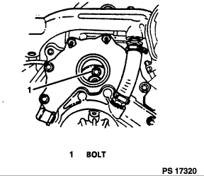 9.Rotate the engine to gain access to the bolts (1) that hold the driven gear to the injection pump. Access is gained through the oil filler neck hole.
