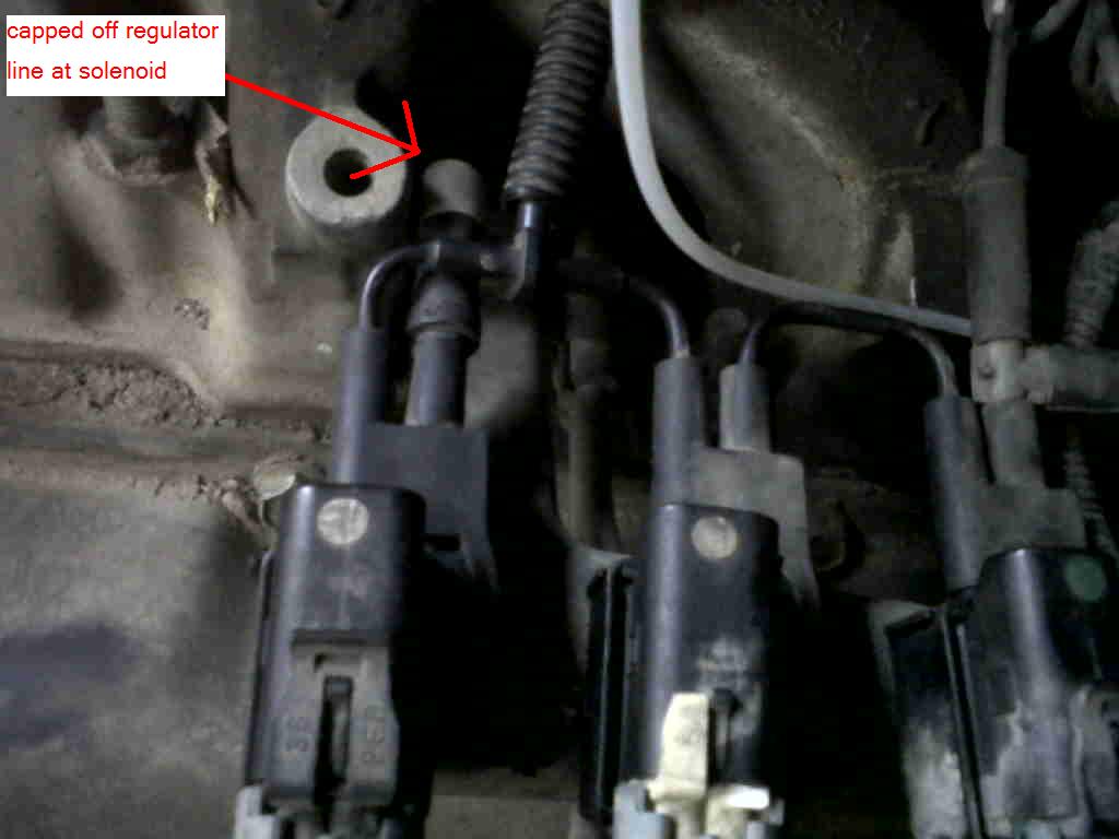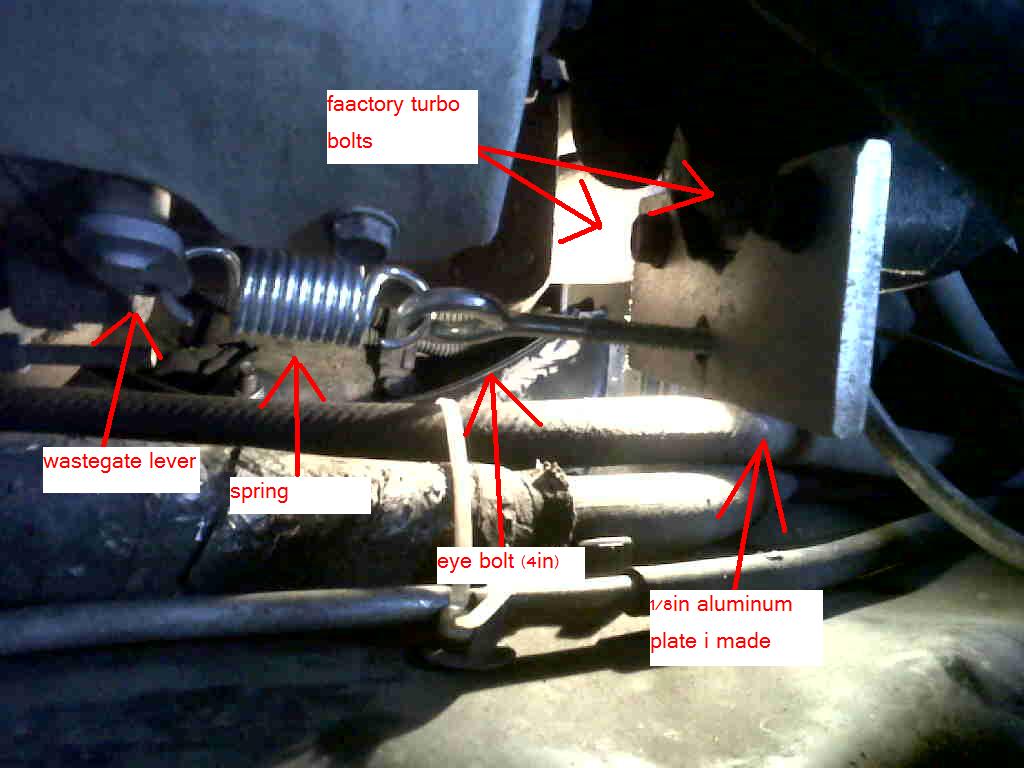 crazy suggested i post this on here so here ya go. i used 1/8th in aluminum plate that i had laying around. A spring, eye bolt and vacuum cap from the local hardware store. i took the factory boost actuator off and marked and drilled the holes from the original mounting holes. i had to trim the plate to fit the curved part of the turbo. then drilled a hole for the eye bolt to pass through. i slipped the open end of the spring onto the actuator lever and the other end on the eye bolt. then put the nut on and tightened it to have a little bit of tension on the spring. i then removed the factory line running from the solenoid to the regulator and capped it off with the vacuum cap. i wouldn't recommend doing this with out a boost gauge. i had to buy a couple different springs to get the boost level right. with each spring i have about a 4psi range of adjustment. right now its set at 11psi of boost wot.