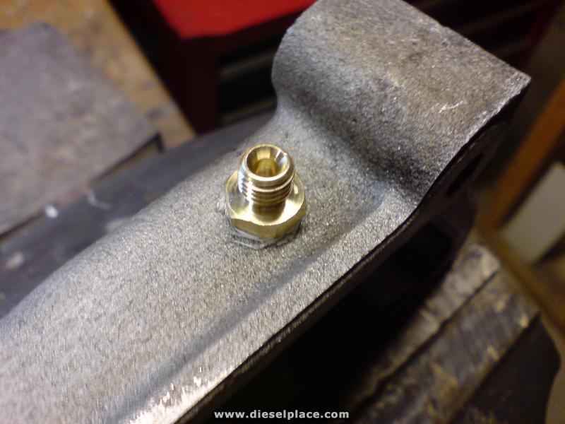 now get your male 1/8npt fitting and wrap some teflon tape around it. this will give it a good seal. screw in the fitting and DONT over tighten, cast aluminum is not the strongest metal!