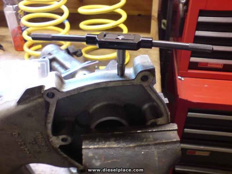 be sure you have the intake in the vise so the surface your working with is flat, then drill the 5/16 hole where desired. put the tap in the hole with the tapping tool, make sure its level and with good pressure start turning the tap clockwise in the hole, this is the most crucial part to get right. the tap will begin to cut into the hole, making the threads. once you see the tap get through to the bottom a lil bit youll want to back the tap out and back in a few times to clear the new threads of metal shavings