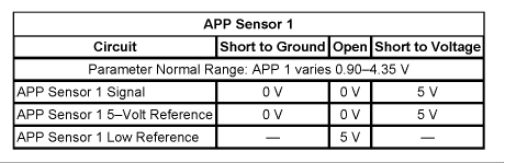 o If less than 0.80 volts , test the APP sensor 1 signal circuit for an open, a short to ground, or a faulty ECM.
