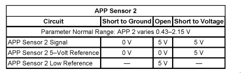 o If more than 4.57 volts , test the APP sensor 1 low reference circuit for an open or a faulty ECM.