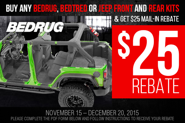 Purchase any BEDRUG, BEDTRED or JEEP FRONT and REAR KITS and receive a $25 mail-in rebate. Jump at the chance! Offer is valid from November 15 through December 20, 2015.