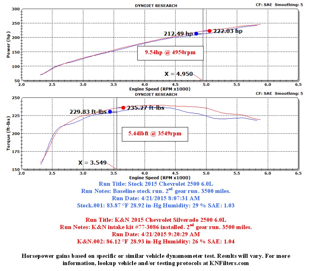 With K&NŽ - 77 Series High-Flow Performance Air Intake Kit you can easily gain 8.26 HP @ 5998 RPM. It is available for the 2015 Silverado HD & Sierra HD 6.0L V8: K&NŽ 77-3086KTK - 77 Series High-Flow Performance Air Intake Kit