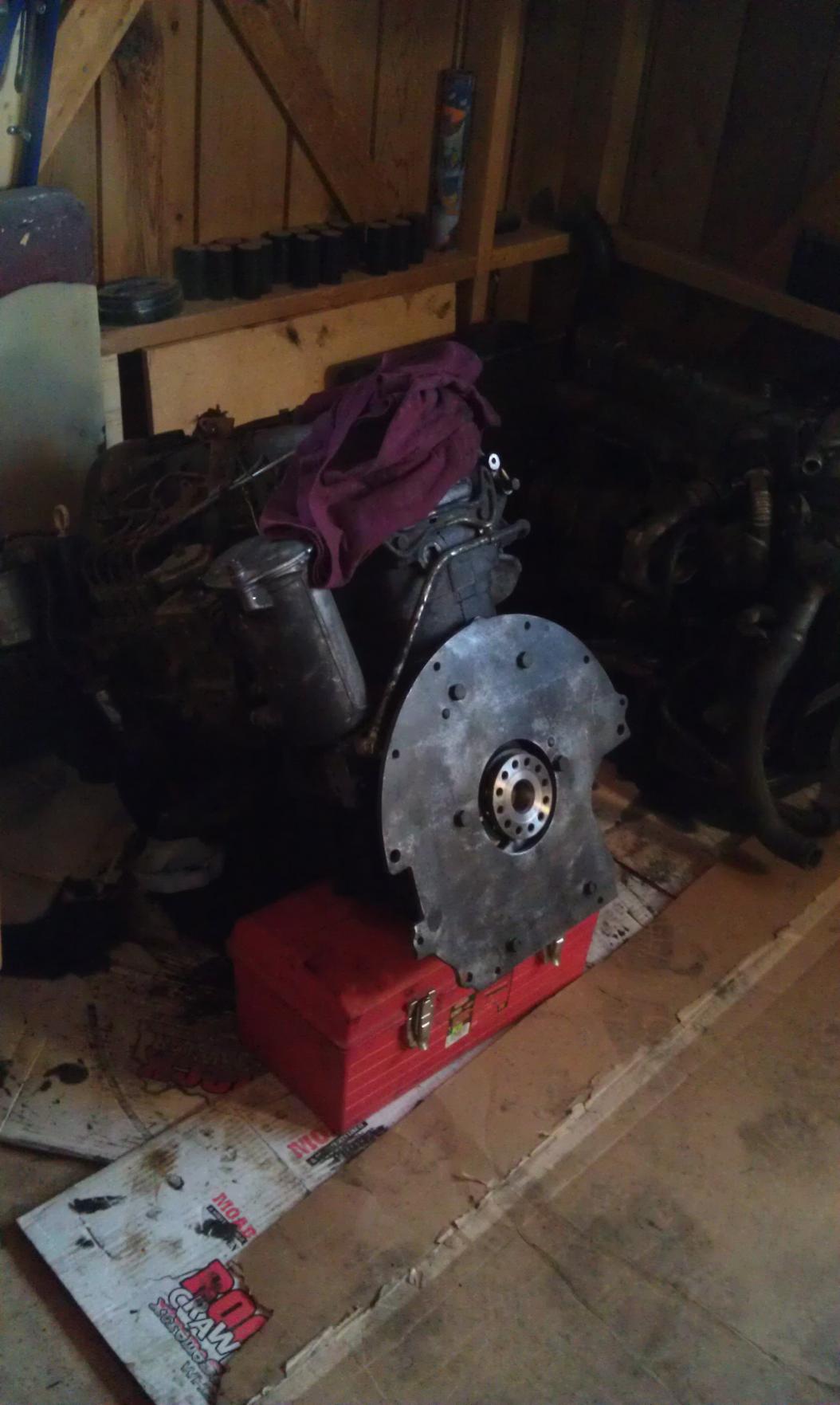 Got the flywheel with adapter installed, New clutch and bellhousing. Pretty tough getting the tranny to line up. Took about an hour. Mounts went in fine, and the engine sits nicely on them. Lift kit will be needed as the oil pan is pretty close to the front diff.