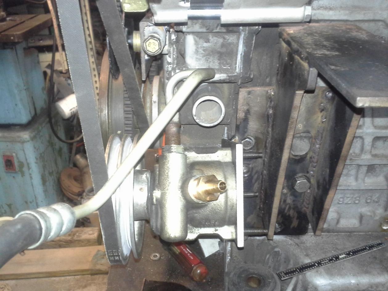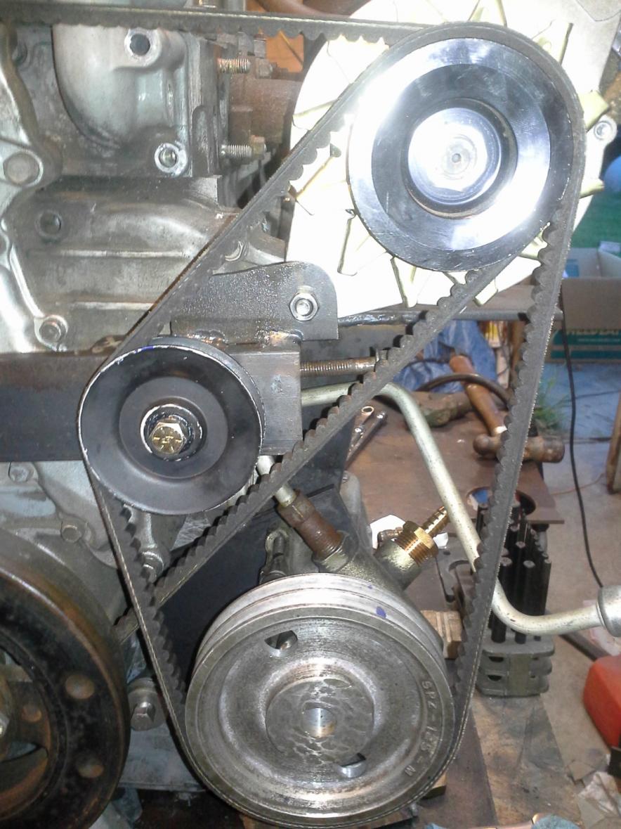 I finally have a decent accessory drive system made up, at least I hope so. I ended up using the OE jeep PS pump with a remote reservoir conversion, and a new v-drive pulley that is a tiny bit smaller dia. than the serpentine pulley, I tried to get the stock PS pump to work with the new serpentine system, but it just was not happening without switching the whole system to serpentine. If I do another one of these, I am pretty sure I will make an all serpentine system from the start.