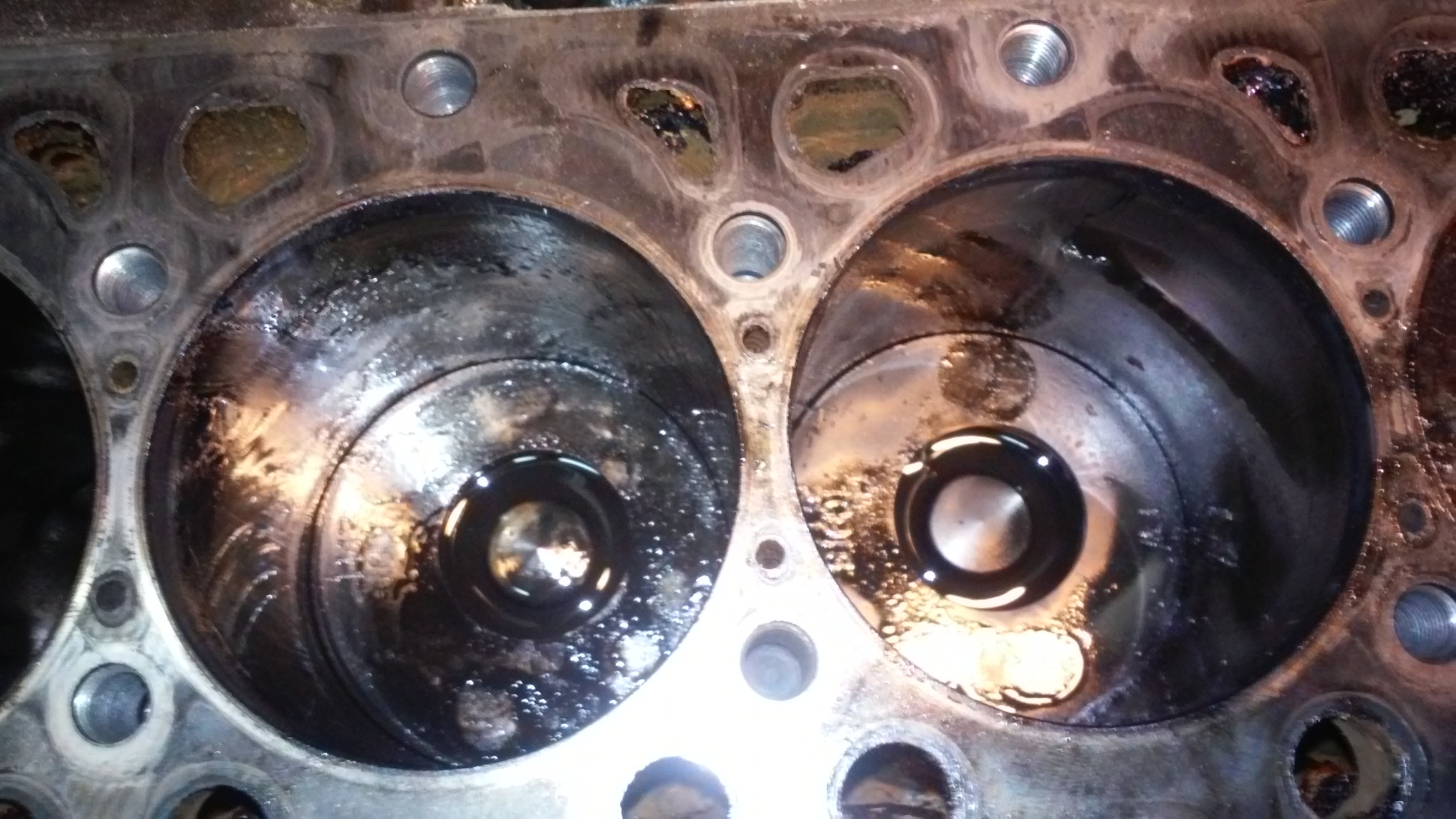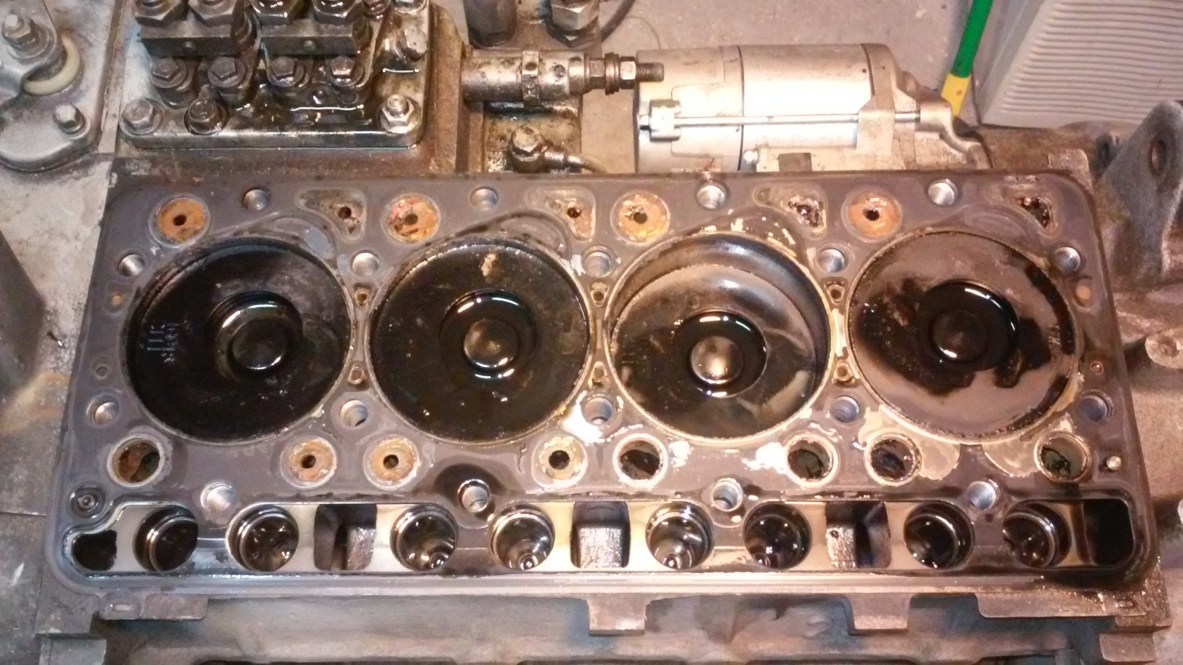 still no smoking gun on what made the metal in the engine. For too many days I thought I could get the crank out without pulling the pistons, I got the head off today and too me if anything it looks like it was not hot enough. the engine is on a stand, and I have been rolling it upside down and back for months, so that I hope is why the pistons have oil in them. any body got any thing to add from the combustion patterns or lack there off. ,about the only problem I have found so far was the 4 tiny little water ports in the head at the outboard sides of #1, and #4 looked pretty blocked to me