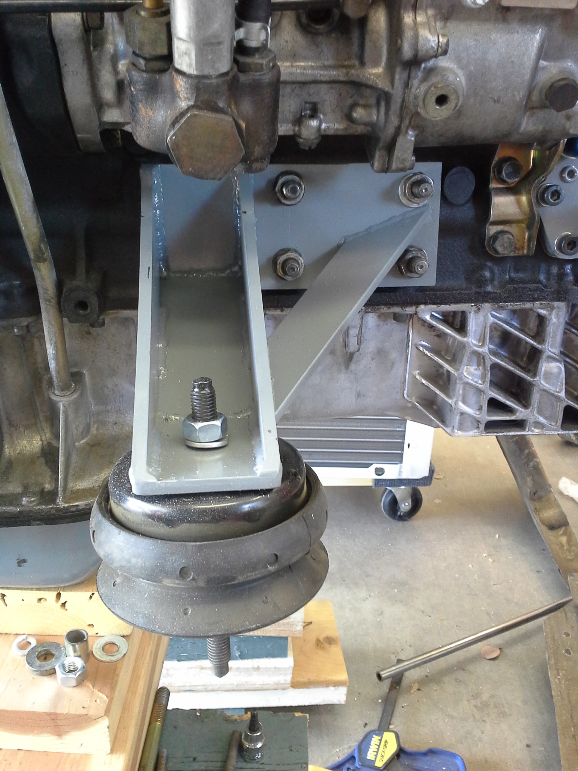 lets see if this works. OK! it worked! This is the re-engineered motor mount arm coming off the drivers side of the engine. I moves the engine back and up about 2 inches. Also shows the Corvette liquid filled motor mount. The plate against the block is 3/8 inch cold rolled bar stock, and the arms are 1/4 inch same. Added the little gusset arm for my own peace of mind.