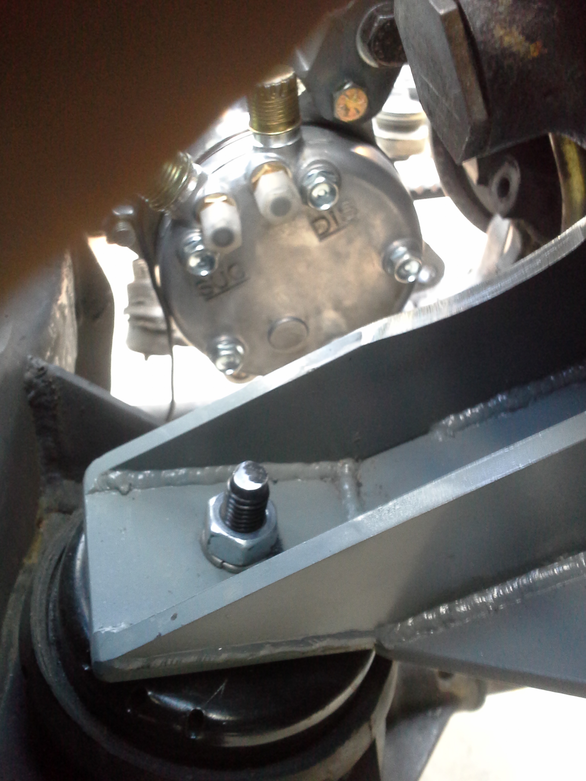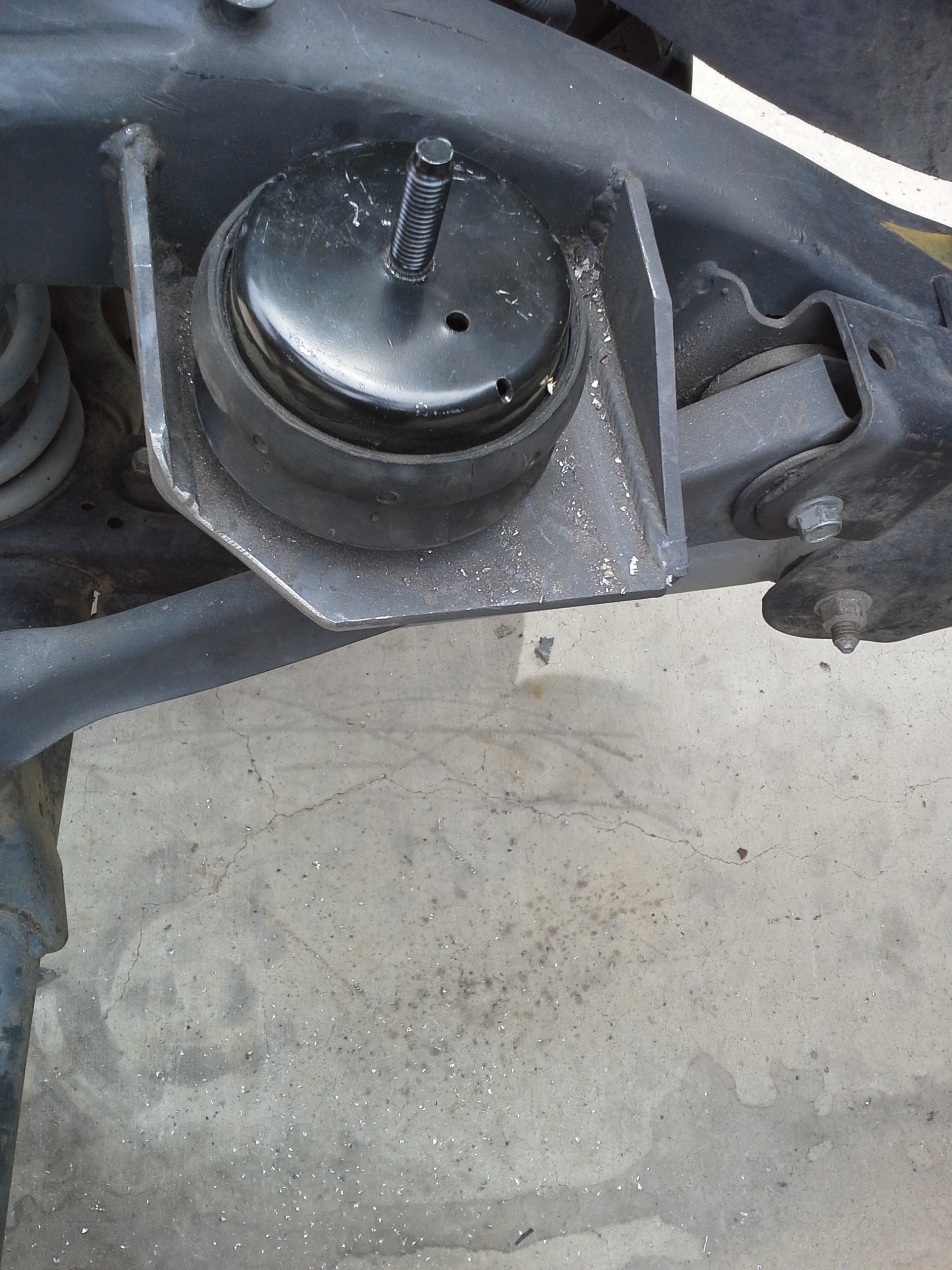 The perches for the mounts are located about the only place I could find. They are sitting right over the upper control arms, and looking back on it I should have come up with better design. At the time I was still trying to keep the stock arms, mounts, and oil filter. With the new motor mounts, the passenger side of the oil pan was contacting the perch on that side. Nothing a cut off wheel and grinder couldn't handle!