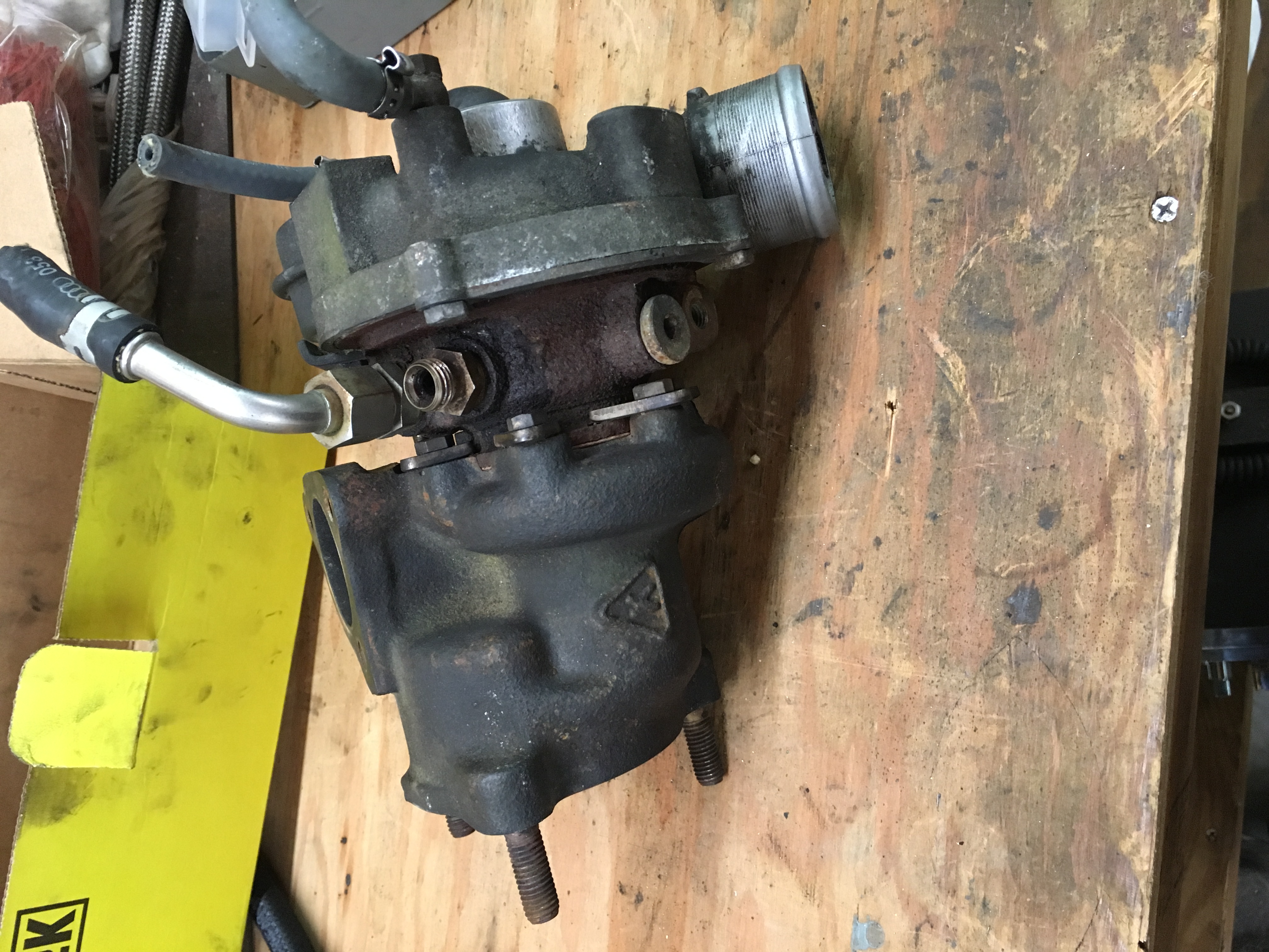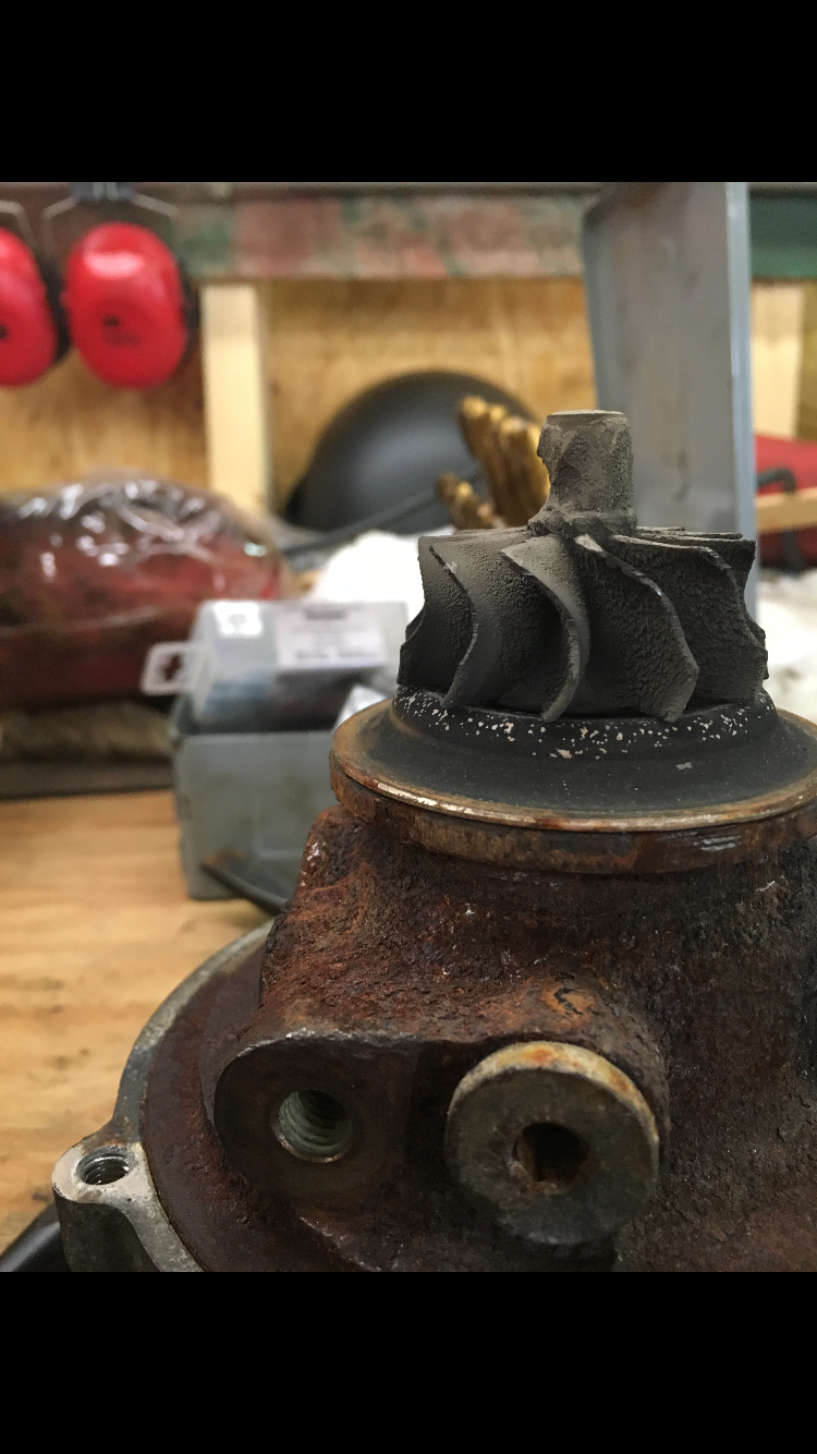 I got a chance to work on the turbo today. I pulled the exhaust housing off and I think it's safe to say this turbo is done without some major work. There are a lot more cracks in the housing than I originally thought, as well as some sort of slag-type protrusion that ate into the turbine wheel. I'll put up some pictures tonight.