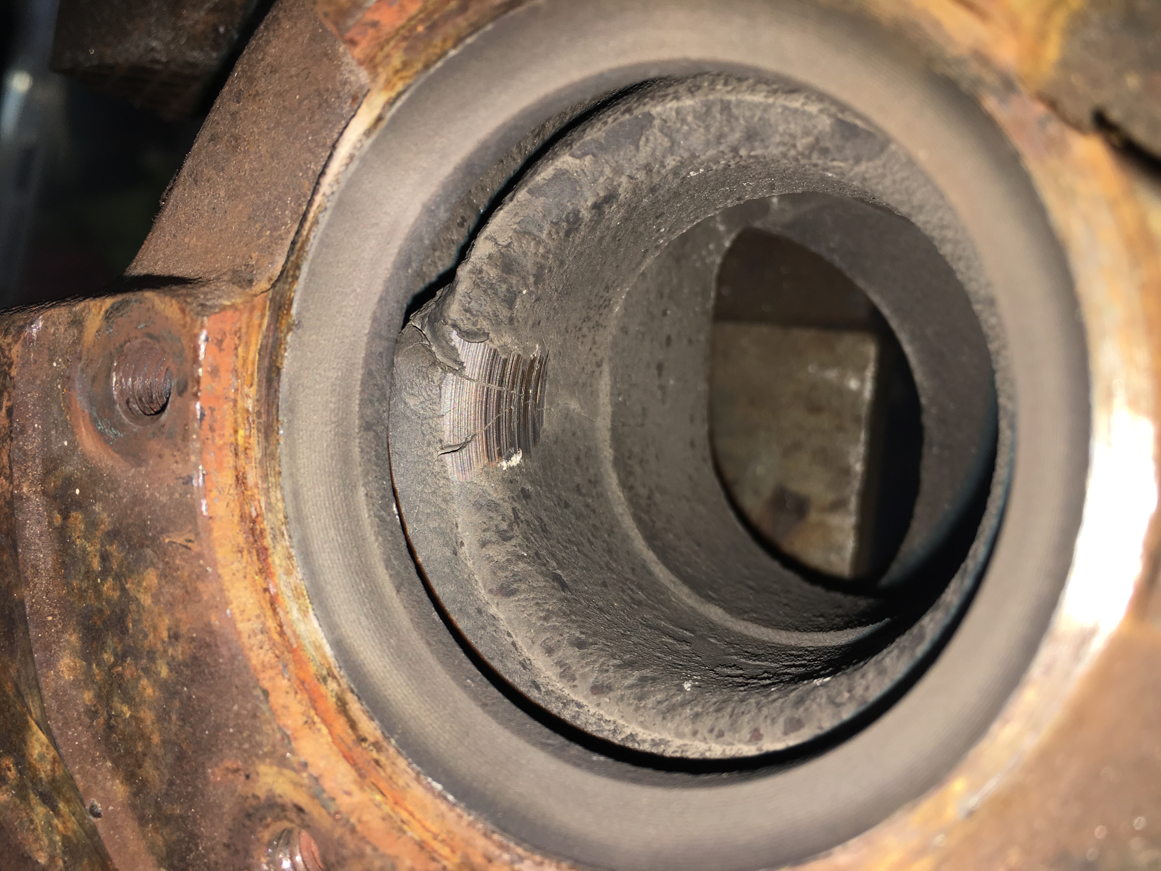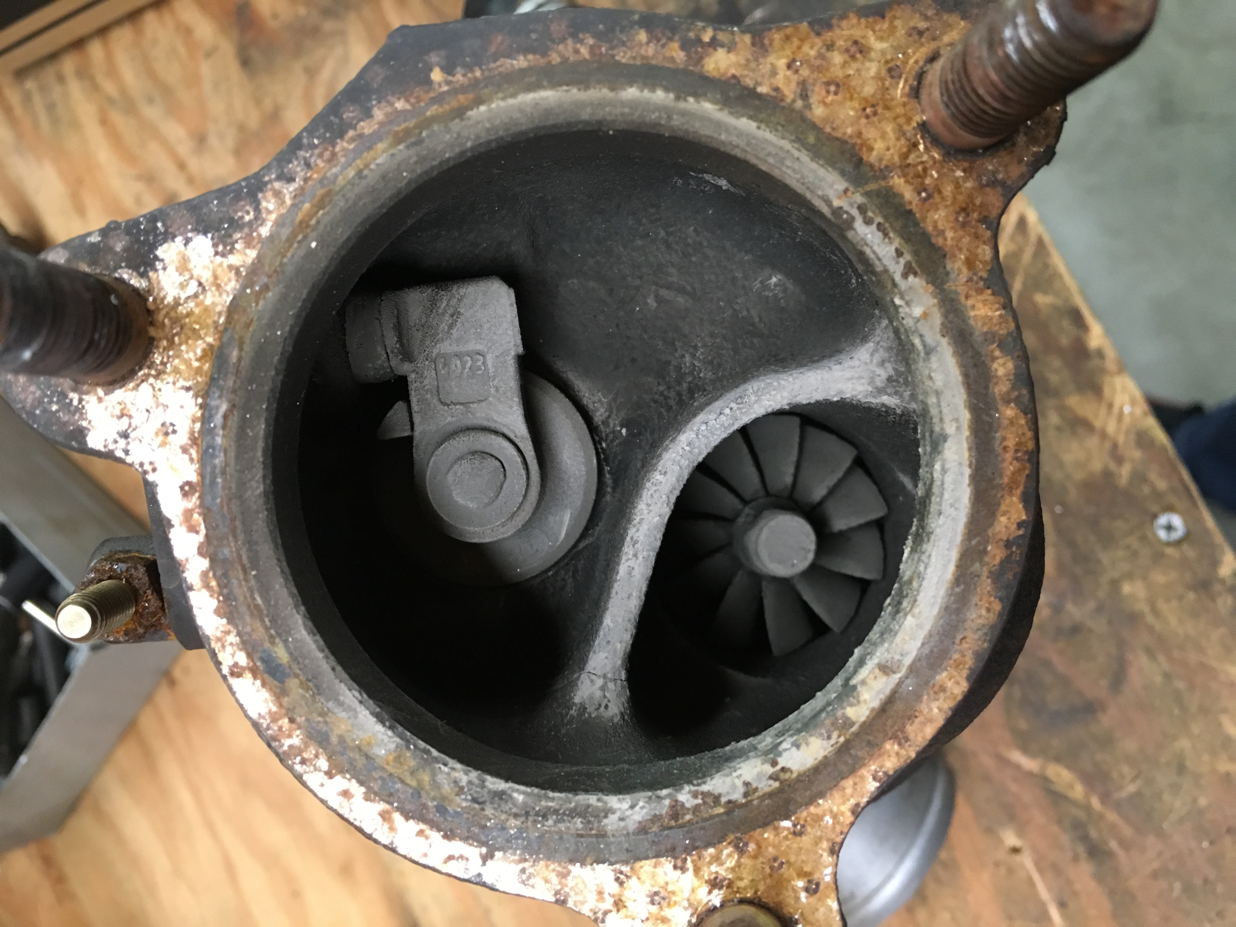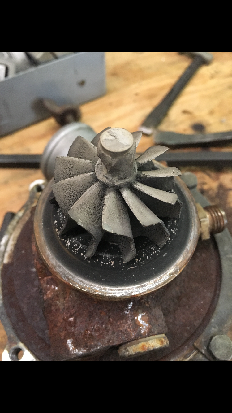 The flat spot where the turbine wheel rubbed the housing has a V shaped crack, and a crack running down the inside of the housing, as well as a wider crack on the inside by the exhaust inlet. I took it to a turbo shop and the guy took one look at it and said the head gasket probably went and dumped coolant into the turbo, causing the cracks and the whitish grey buildup, which I thought was just the turbo running properly. I'll have to try and pull the compressor housing off and decide if I'm going to rebuild this turbo or find a different one. I have been eyeing a g2052v off a 2.5 diesel VW transporter. Or a gt17. All China clones, but nice none the less.