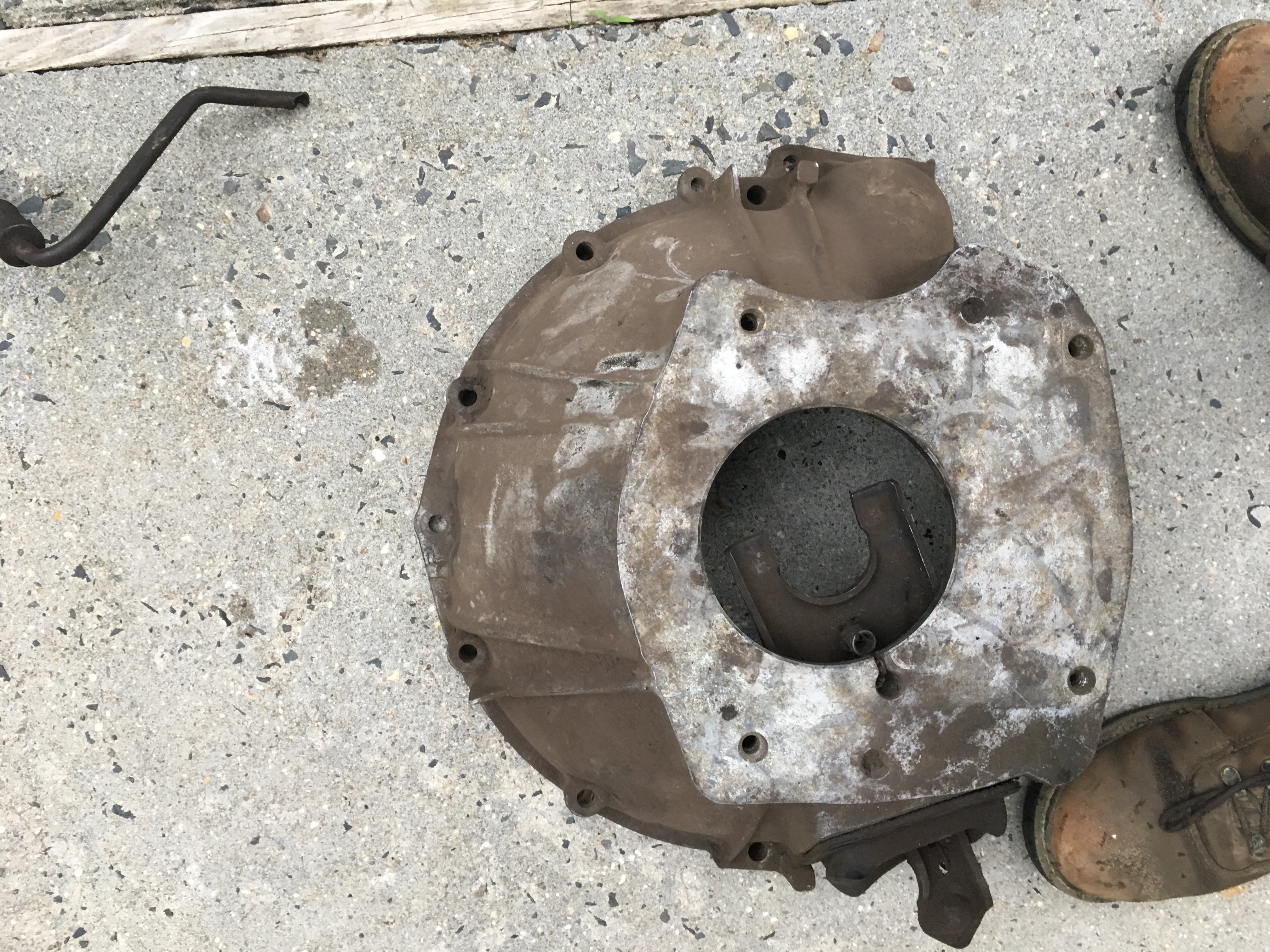 The bell housing I was looking for I couldn't find, so I have to make this one work. The bell housing to mount a T176 to an AMC I6 or V8 has the same pattern as the np435, which is the easiest route. Mine is drilled for a T5, which won't allow me to bolt the trans on. I have to drill and tap the bell housing for the Ford butterfly pattern, which should be easy as AMC so graciously marked the holes I need to drill. If I was using an SM420 or 465, or a T5 for that matter, the bell housing would be perfect. But since when is anything bolt on with a project of this size?