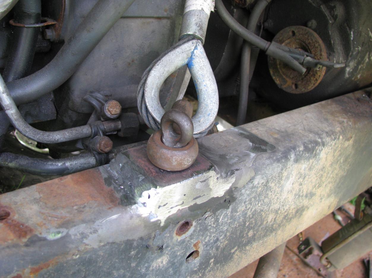 here,s one of my engine restraints mounting points-4.5 tonne steel hawser,0.5 inch plate to reinforce chassis-