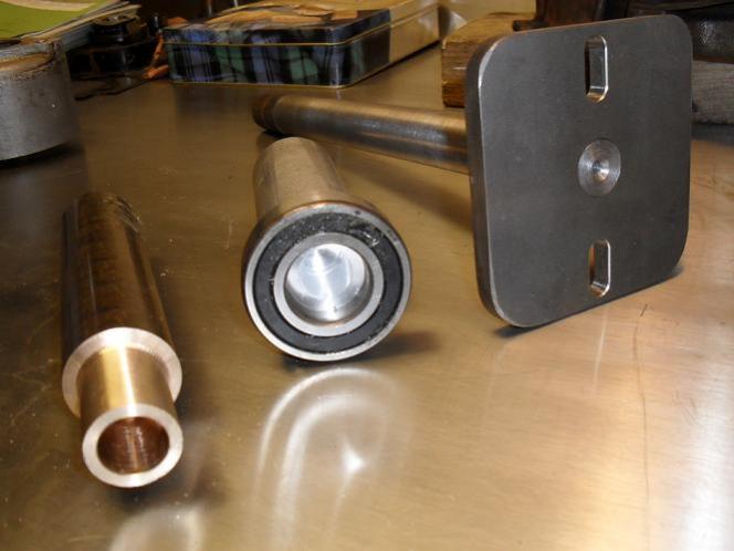 well got home and straight back to the truck,it,s real rainy and soggy here in england right now,so i got on the lathe and made a few pieces,im going for the phosphor bronze bush held in a ally adaptor that mounts into the pilot bearing which mounts in the flywheel.