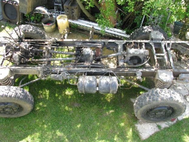 once i,d bullied all the junk and no need for stuff off it i was left with this-lovely straight chassis rails [easy to move stuff about]-portalaxles-shrouded props-coil suspention-2.5tonne pto driven winch riding on 20,s