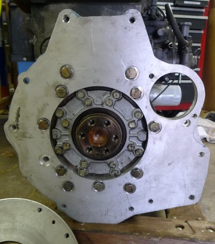 Here's the adapter plate for the earlier Ranger trucks (up to 1997). I bought this with the engine. This fall I'm going to convert an 2002 Ranger. I'm going to use the flywheel housing as the template for the new adapter plate and mate it with the transmission with the 3.0 V6 bolt pattern.