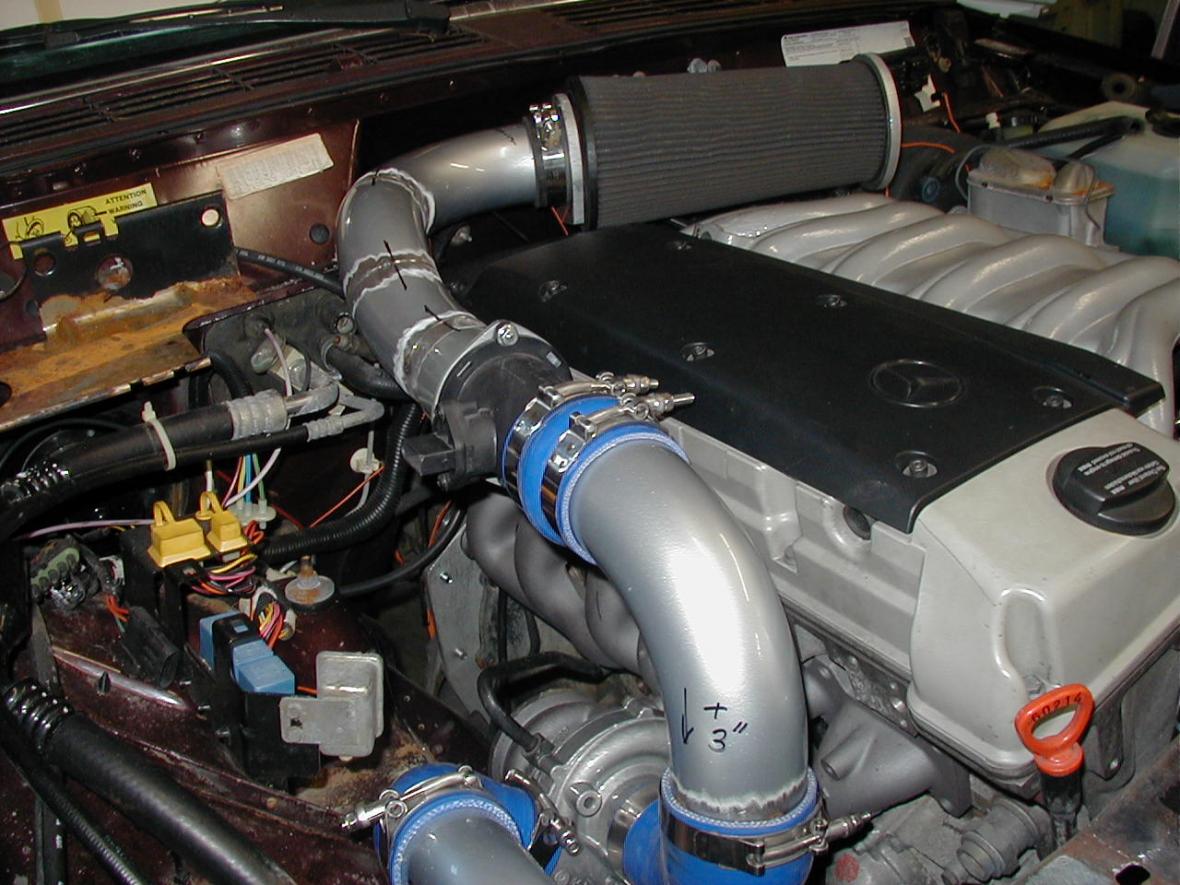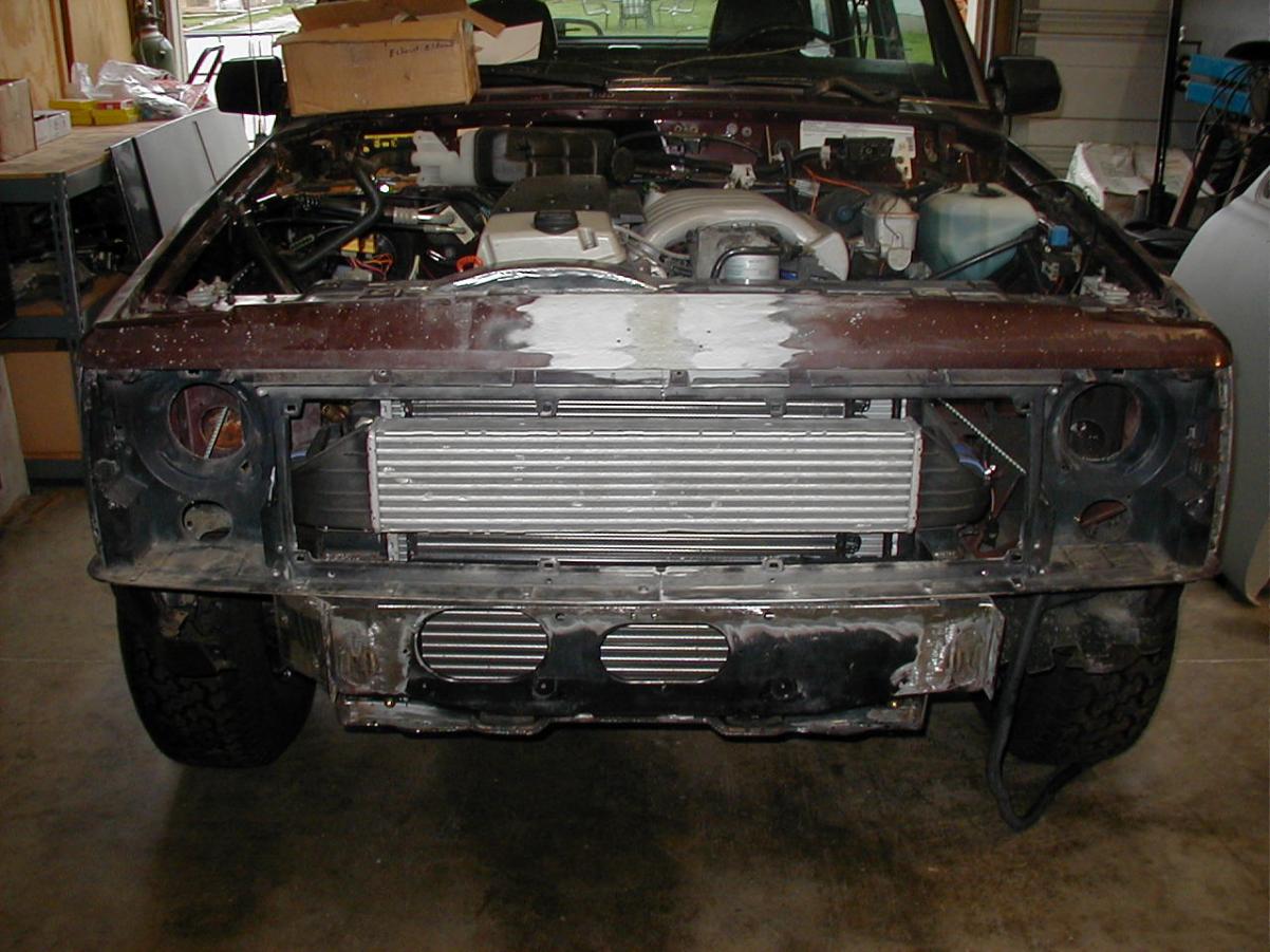 89 Jeep Cherokee with a 99 Mercedes 606 3.0 24 valve dual overhead cam turbo diesel. Engine is adapted to transmission with a custom adapter. Body sheet metal is extended 4" for oil pan sump clearence.