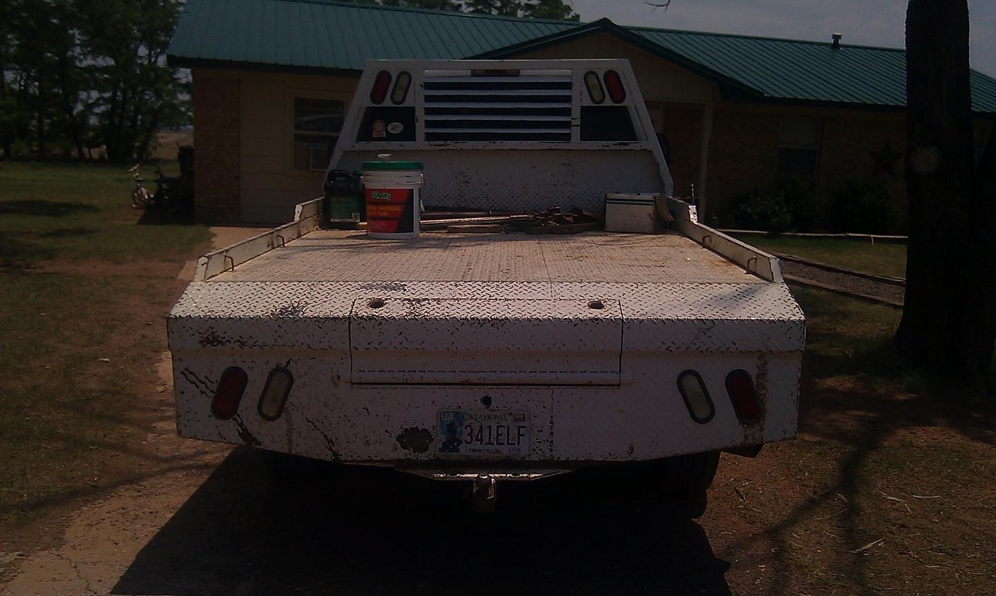 Hydraulic resevoir, toolbox, and L-shaped transfer tank, gooseneck hitch and small toolbox at the back, tailgate removed using the "unhitch gooseneck & drive-off" method (also performed by previous owner).