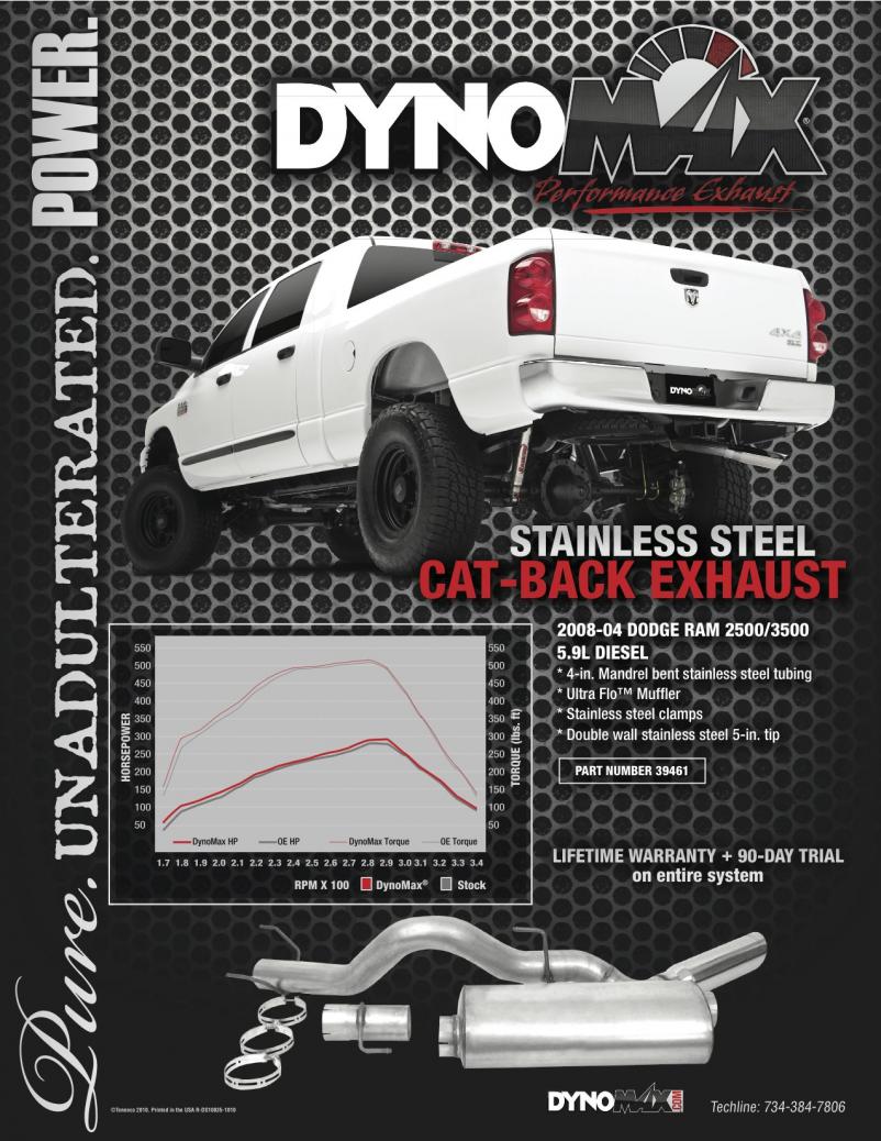 Here is some information on our cat back stainless steel exhaust system for the 2004 to 2008 5.9L Dodge. With our system we saw a gain of 16 HP over stock and 25 gain of torque.