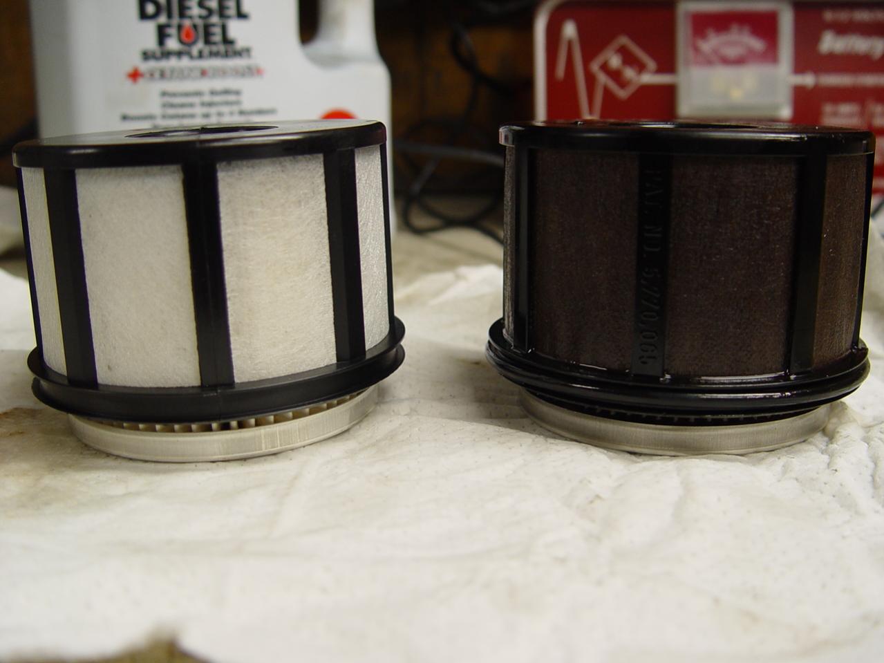 These pics are of the filter that I took out, and the new one beside it. What do you guys think? Does it look normal for a used filter, or worse? The housing that the filter fits down in looks clean and fuel looks normal and no water. I will look for a better code reader, I did use a AutoZone type reader. I also put some of that diesel fuel additive in.